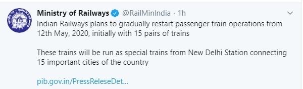 Indian Railways plans to gradually restart passenger train operations from 12th May, 2020, initially with 15 pairs of trains (30 return journeys). These trains will be run as special trains from New Delhi Station connecting Dibrugarh, Agartala, Howrah, Patna, Bilaspur, Ranchi, Bhubaneswar, Secunderabad, Bengaluru, Chennai, Thiruvananthapuram, Madgaon, Mumbai Central, Ahmedabad and Jammu Tawi.
