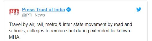 गृहमंत्रालय की ओर से जारी आदेश में कहा गया है कि लॉकडाउन से कोरोना वायरस के खिलाफ लड़ाई में देश को काफी लाभ हुआ है। लॉकडाउन को 4 मई से अगले 2 सप्ताह तक बढ़ाने की घोषणा की जाती है। रेड, ग्रीन और ऑरेन्ज जोन के लिए अलग-अलग गाइडलाइंस तैयार की गई है। ग्रीन और ऑरेन्ज जोन में काफी छूट भी दी गई है।