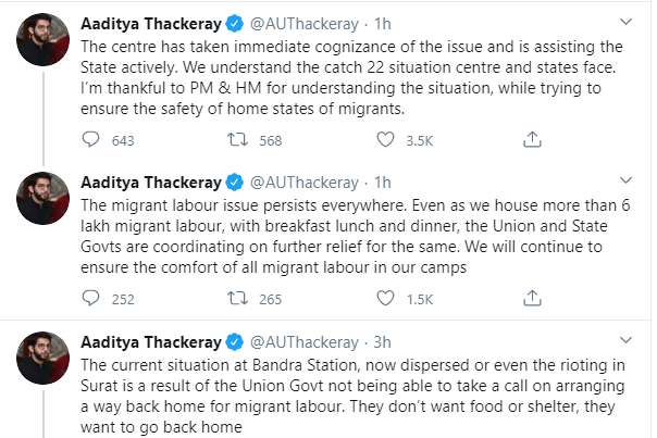 आदित्य ठाकरे ने आगे कहा कि ट्रेनों का परिचालन शुरू से ही बंद है। महाराष्ट्र सरकार ने केंद्र सरकार से 24 घंटे के लिए ट्रेन शुरू करने के लिए कहा था, जिससे कि प्रवासी मजदूर अपने-अपने प्रदेश वापस जा सके। मुख्यमंत्री उद्धव ठाकरे ने प्रधानमंत्री के साथ बातचीत में भी प्रवासी मजदूरों को उनके घर वापस भेजने के लिए रोडमैप बनाने का मुद्दा उठाया था।