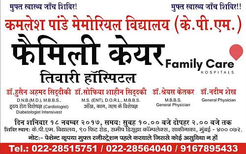 कमलेश पांडेय मेमोरियल स्कूल व फॅमिली केयर तिवारी हॉस्पिटल के संयुक्त प्रयास द्वारा शनिवार, 18 नवंबर को कमलेश पांडेय मेमोरियल स्कूल, 90 फ़ीट रोड, साकीनाका में फ्री मेडिकल कैंप का आयोजन किया गया है। इस अवसर पर स्थानीय आर्थिक रूप से कमज़ोर वर्ग के लोगों के लिए मुफ्त स्वास्थ्य जाँच शिविर रखा गया है। इस कैंप में डॉ. हुसैन अहमद सिद्दीकी, डॉ. सोफ़िया शाहीन सिद्दीकी, डॉ. श्रेयस केतकर, डॉ. नदीम शैख़ व अन्य डॉक्टरों की टीम मौजूद होंगी। यह कैंप सुबह 10 बजे से दोपहर २ बजे तक चलेगा।