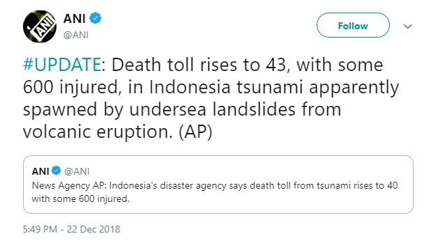 जकार्ता: रिंग ऑफ फायर कहे जानेवाले इंडोनेशिया में फिर सुनामी ने भारी तबाही मचा दी है। इंडोनेशिया की सुंदा खाड़ी में सुनामी की चपेट में आकर 43 लोगों की मौत हो गई। 584 जख्मी हैं। आपदा प्रबंधन विभाग के अधिकारियों के मुताबिक, शनिवार देर रात अनाक क्राकातोआ ज्वालामुखी फटने के बाद समुद्र के नीचे भूस्खलन आ गया। इससे उठी ऊंची लहरों ने तटीय इलाकों को अपनी चपेट में ले लिया। दक्षिणी सुमात्रा के किनारे स्थित कई इमारतें तबाह हो गईं।